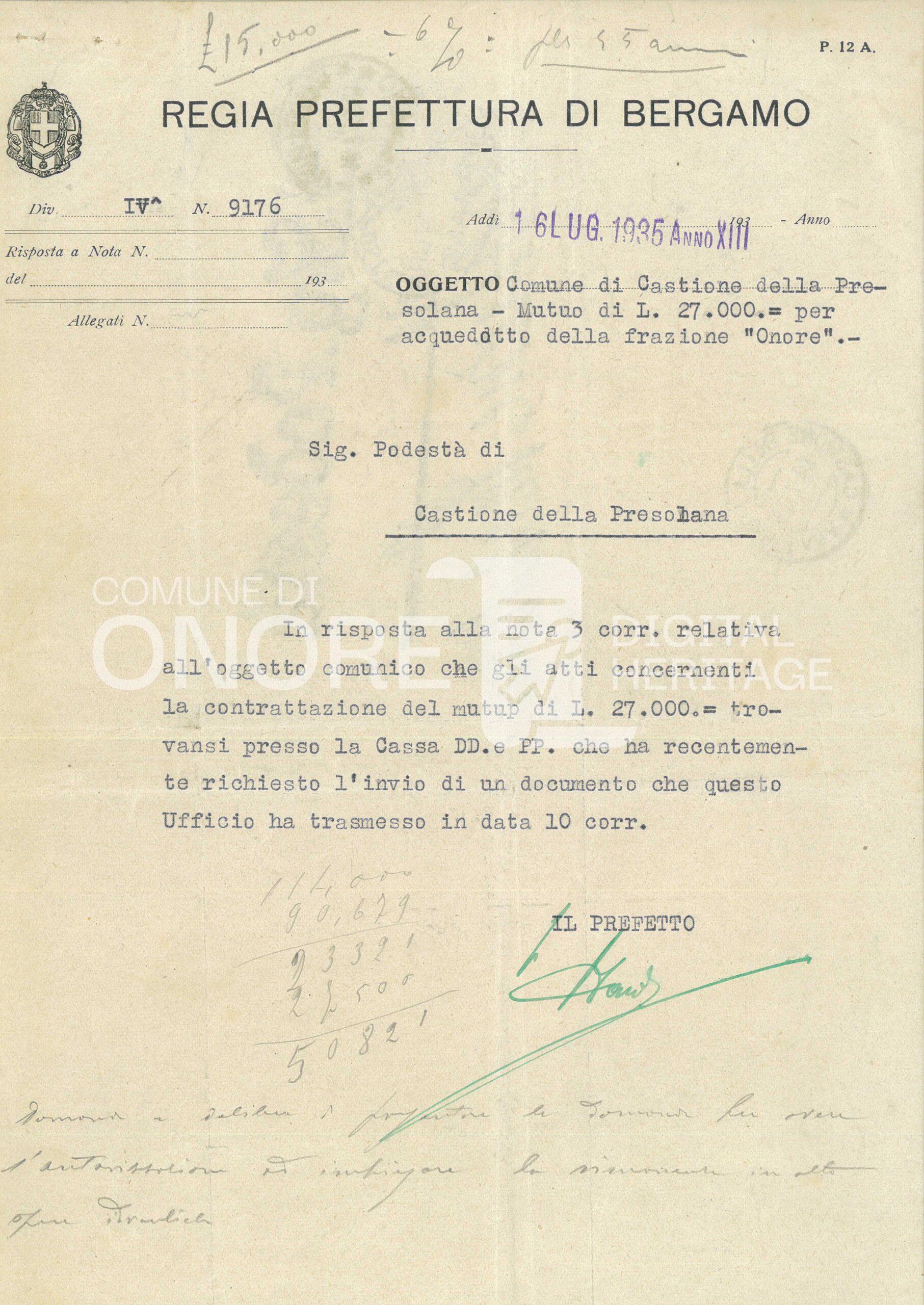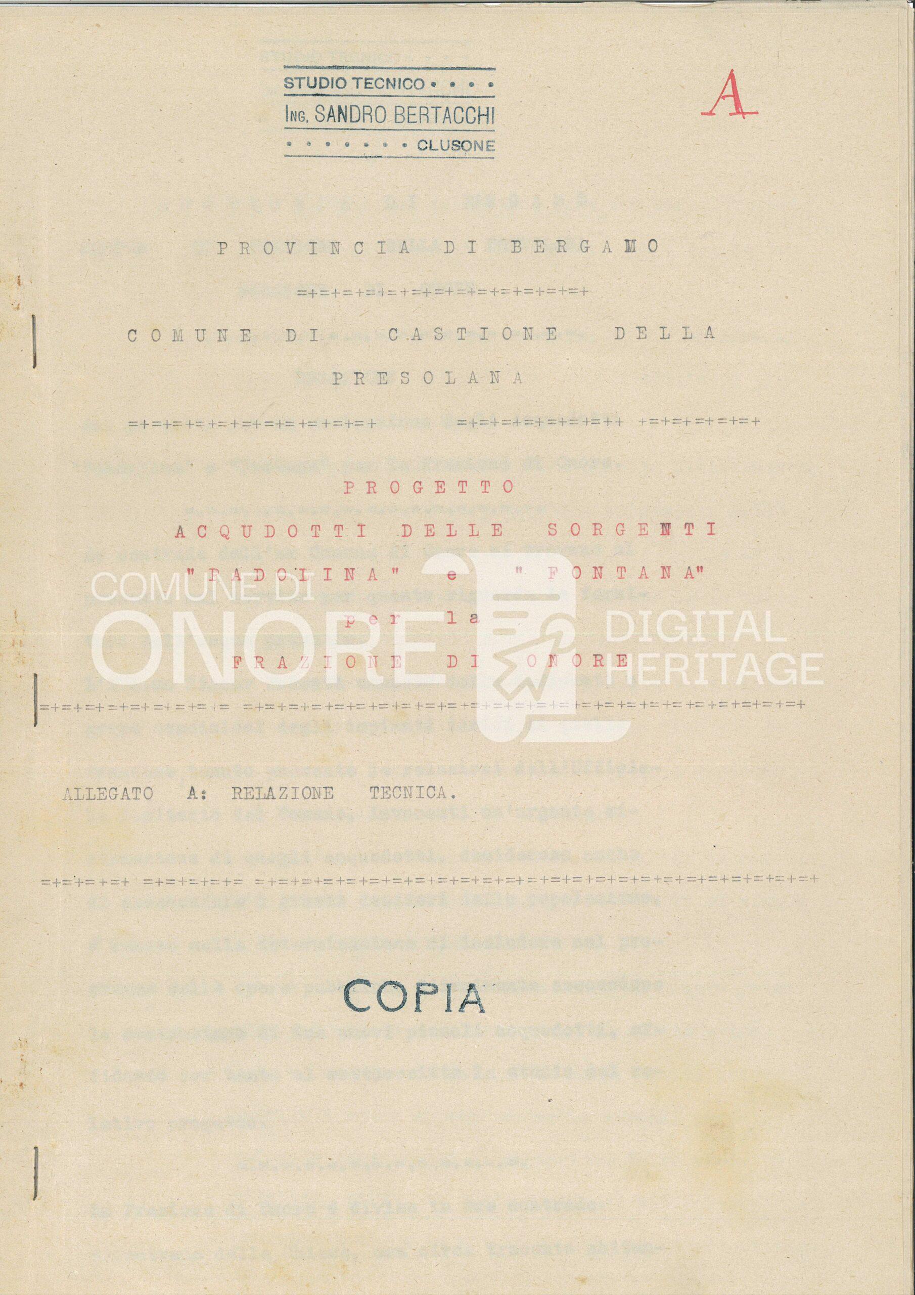 Progetto dell’ing. Sandro Bertacchi di Clusone degli acquedotti delle sorgenti Fontana e Pandolina nella frazione di Onore nel comune di Castione della Presolana.