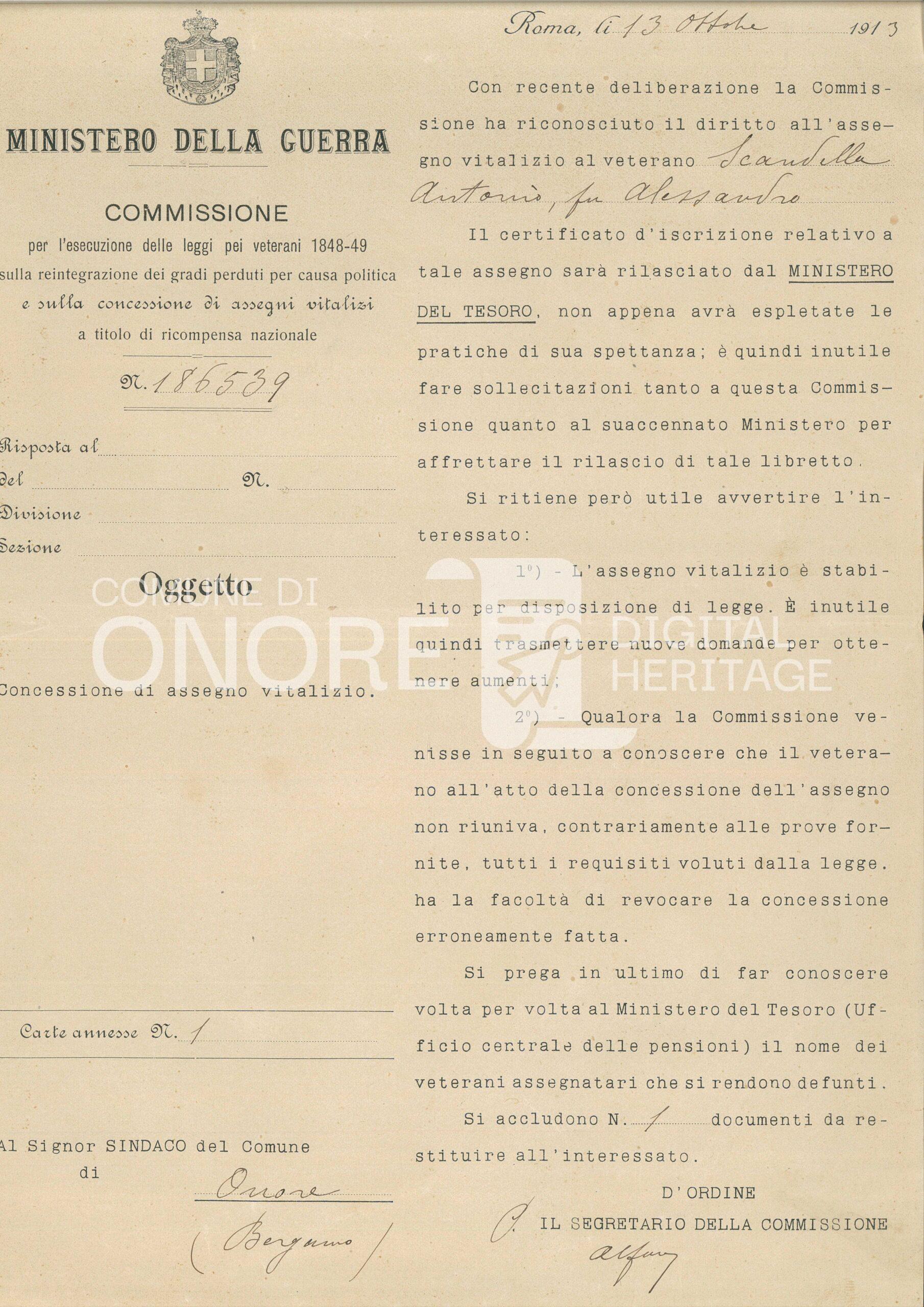 Assegno vitalizio al militare Scandella Antonio 1913