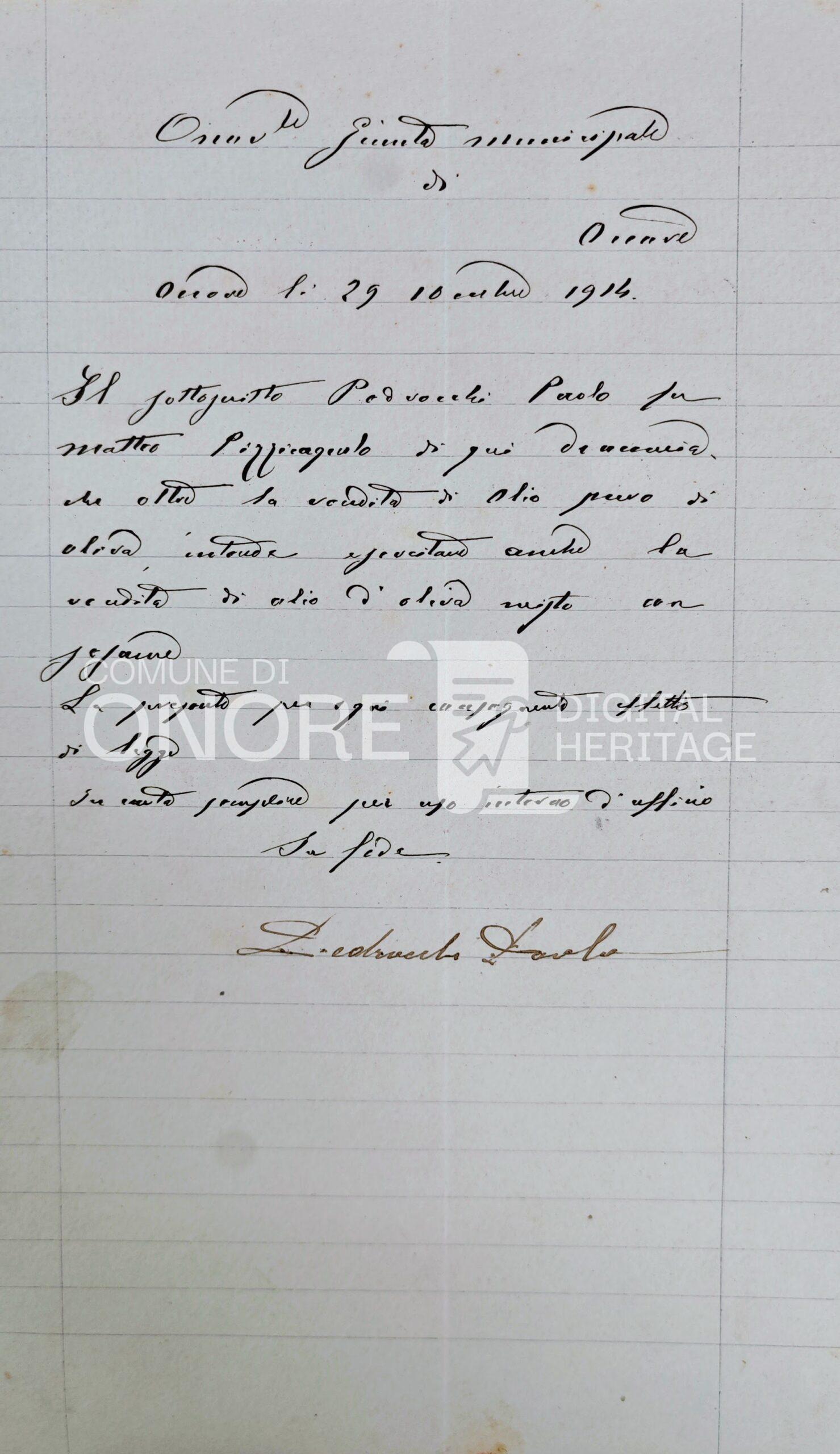 Comunicazione di Paolo Pedrocchi, mastro pizzicagnolo di Onore, alla giunta comunale, che oltre all’olio pure vende anche l’olio oliva misto con sesamo.