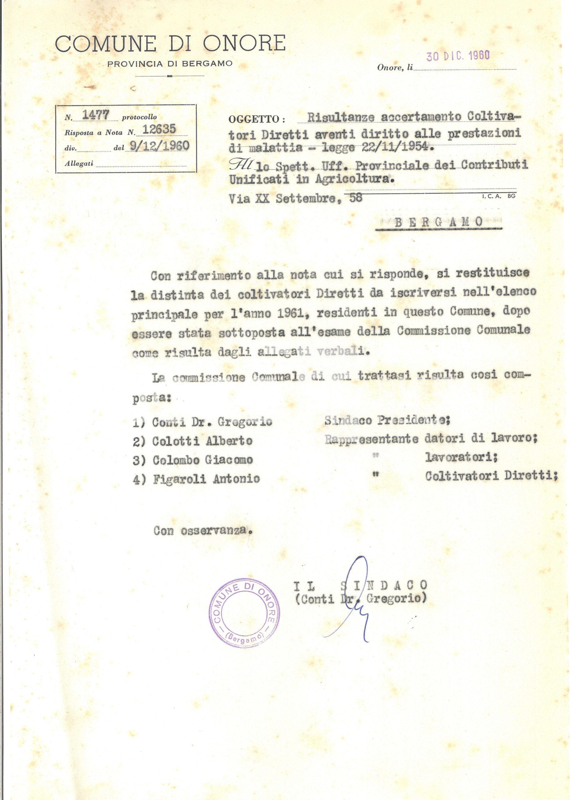 Verbale di riunione della Commissione Comunale per l’accertamento dei lavoratori dell’agricoltura, 24 dicembre 1960.